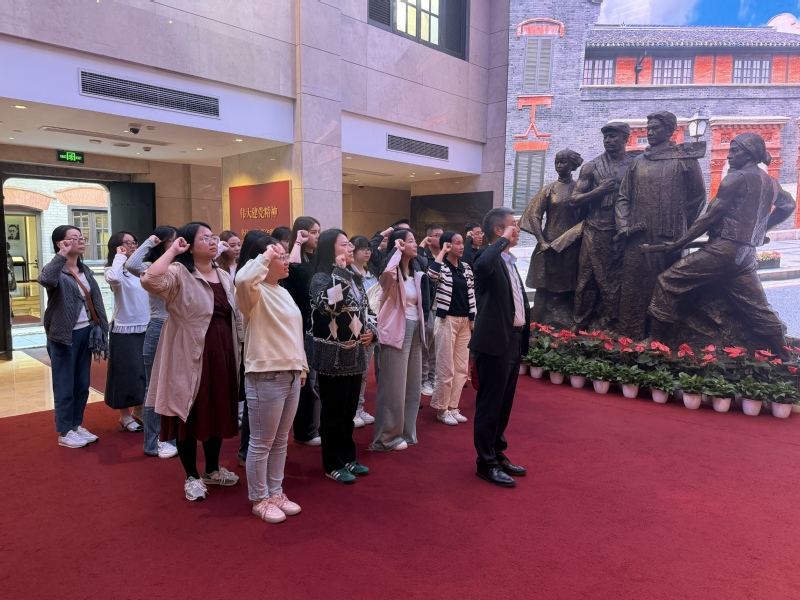 随后,党员师生来到活动的第二站----中共二大会址纪念馆,在这庄严的厅堂,全体党员师生整齐列队,在党总支书记赵立辉的带领下,庄严肃穆面向党旗,举起右拳,重温入党誓词,铿锵有力的誓言回荡在百年厅堂,抒发着师生党员对党忠诚的决心,表达了为共产主义事业奋斗终身的坚定信念。透过珍贵史料与场景复原,重温了党探索革命道路的艰辛历程与执着追求。在《中国共产党党章》学习厅,大家认真阅览各个时期的党章,一致表示要将党章作为根本行为规范,自觉学习遵从、践行使命,把党员的责任意识转化为实际行动。