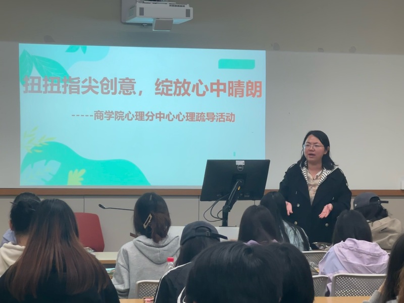 秋雨微凉的周四傍晚,商管楼136教室却暖意融融。一场以“扭扭指尖创意,绽放心中晴朗” 为主题的心理疏导活动在此开展。60余名商学院学子暂时卸下课业的重压与生活的琐碎,在沉浸式的手作体验中,让积压的情绪随指尖的灵动,绽放成一朵朵独一无二的“治愈之花”。
