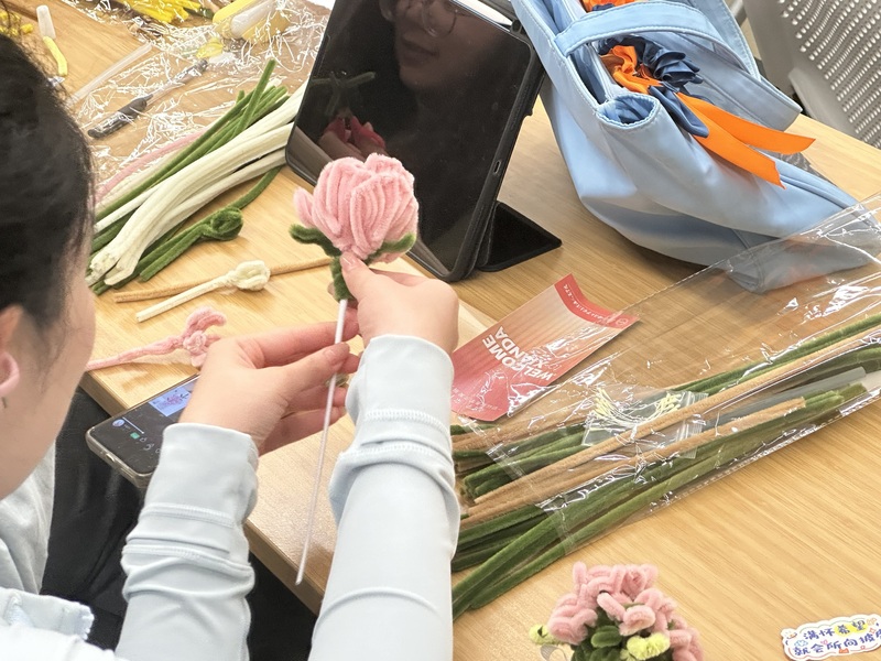 活动伊始,商学院心理分中心负责老师冷涛主持开场,在欢迎大家的到来后她表示心理疏导从不只局限于语言交流,沉浸式的体验也能帮助大家放松紧绷的神经、释放内心的压力。而扭扭花手工恰好具备这样的优势:操作门槛低,创意空间却极大,同学们在专注缠绕、精心塑形的过程中,注意力能从负面情绪中抽离,转而投入到对作品的创作中,当一朵朵形态各异的花朵最终完成时,那份实实在在的成就感,更是对心灵最直接的慰藉,能有效实现心理疗愈的效果。