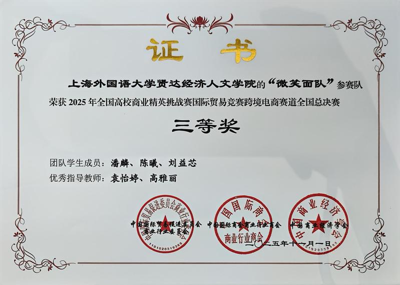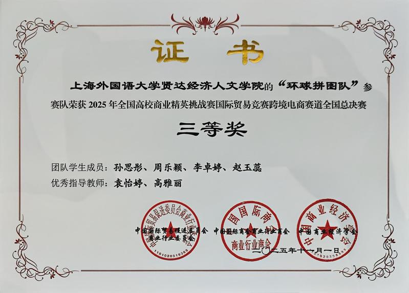 近日,2025年全国高校商业精英挑战赛跨境电商赛道全国总决赛落下帷幕。上海外国语大学贤达经济人文学院国际贸易专业学生组成的“环球拼图队”和“微笑面队”两支团队,历经了上海市赛的激烈角逐与全国赛的巅峰对决,凭借扎实的专业功底、创新的运营方案,以及默契的团队协作,斩获全国三等奖的优异成绩,为校争光。