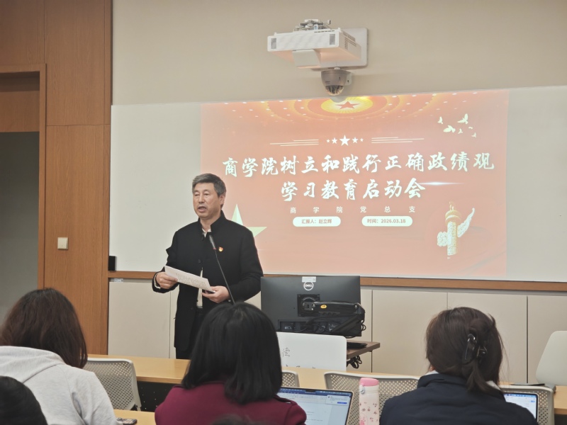 3月18日,根据上级和校党委学习教育要求,商学院党总支在商管楼135教室召开树立和践行正确政绩观学习教育启动动员会,共同深入学习贯彻习近平总书记关于树立和践行正确政绩观的重要论述。学院党总支书记赵立辉作动员讲话,商学院全体党员参会,共同锚定育人初心使命,凝聚学院改革发展提质增效的奋进力量。